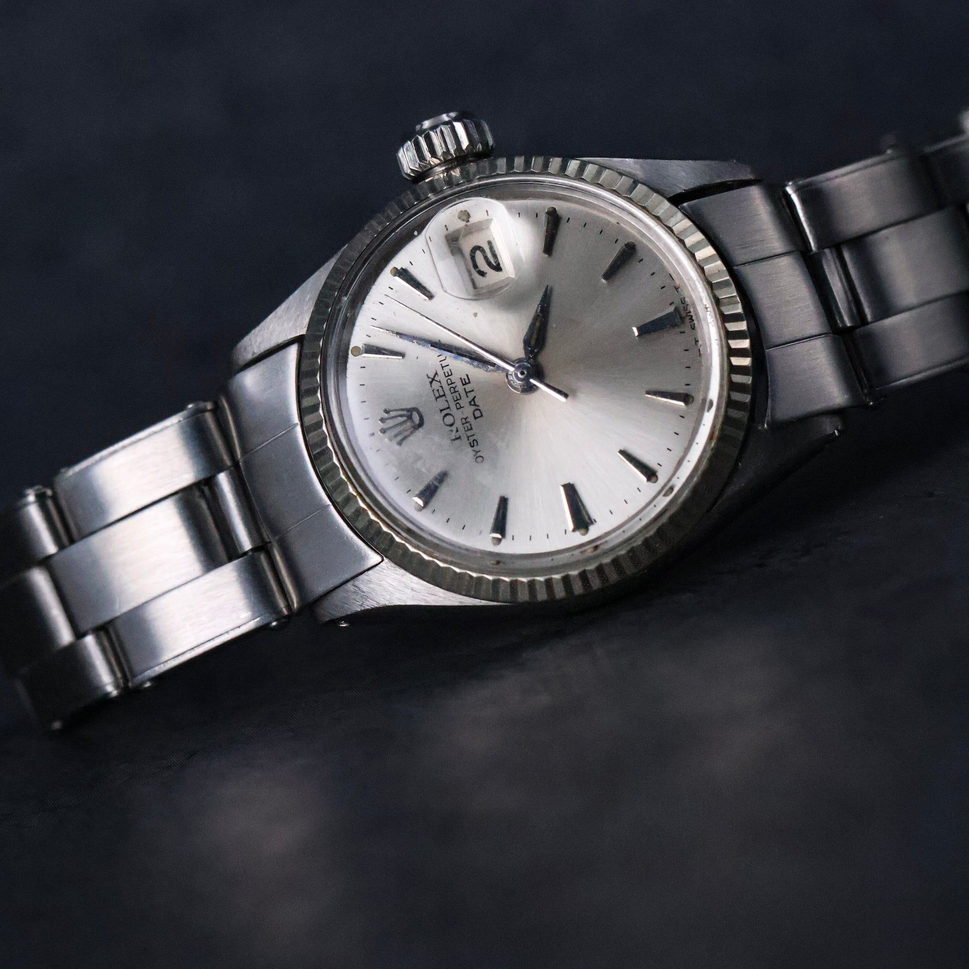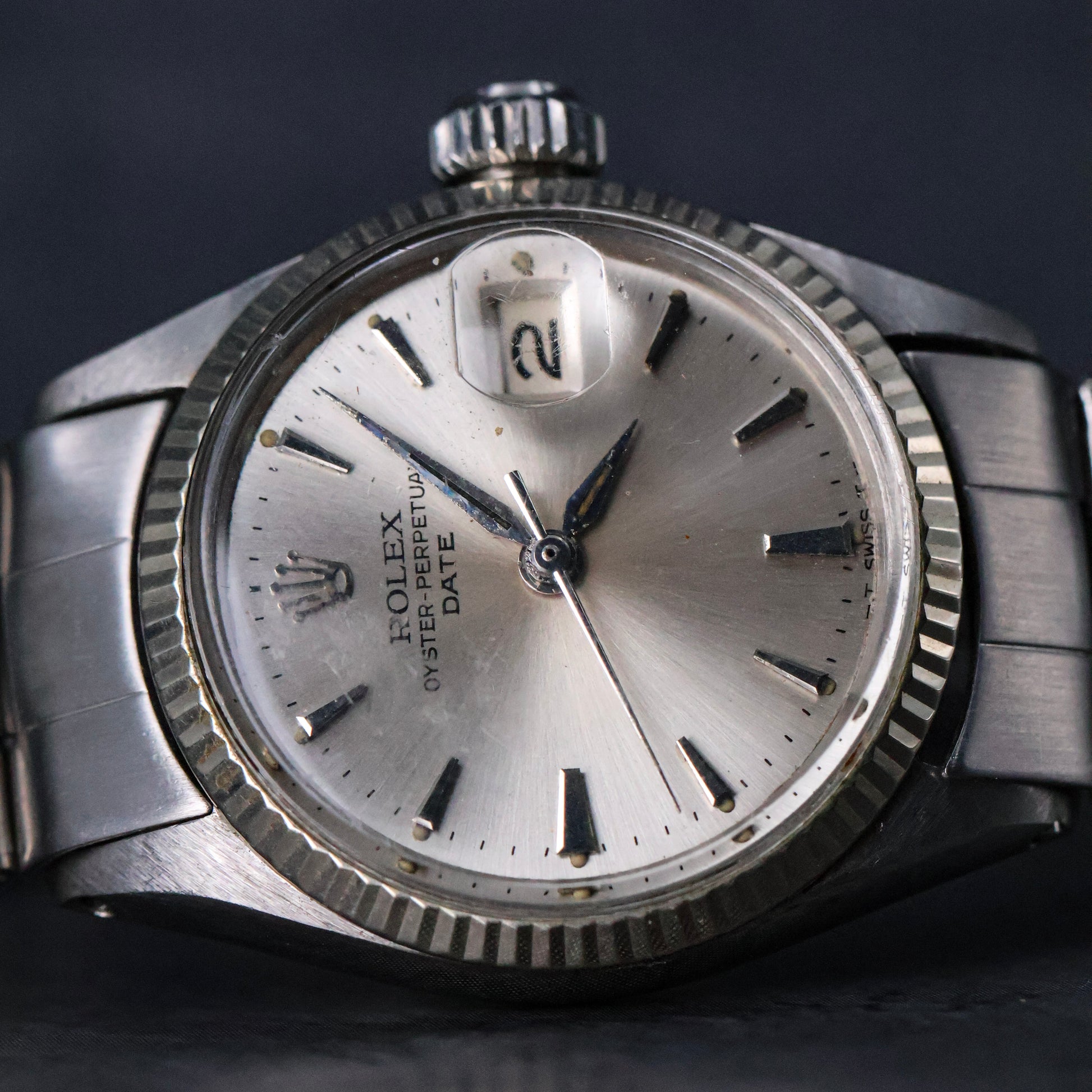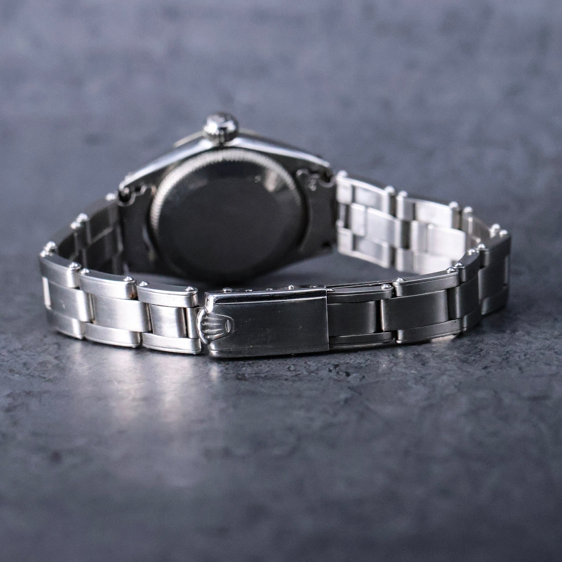 The dial is what collectors often refer to as a “No Lume” configuration. While tritium is indicated by the T SWISS T marking at 6 o’clock, the absence of luminous plots gives the dial a cleaner, more understated look. Many collectors consider this one of the most elegant dial executions Rolex ever produced, especially on smaller Oyster models.