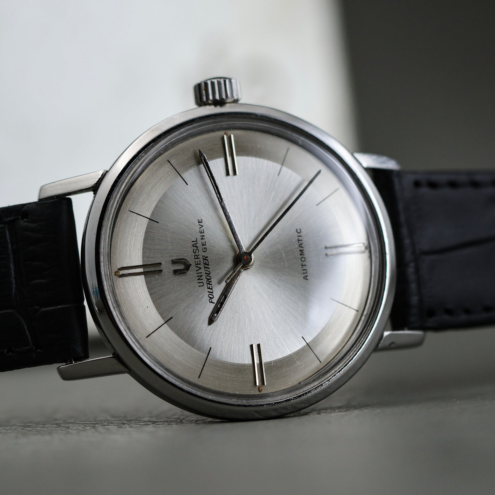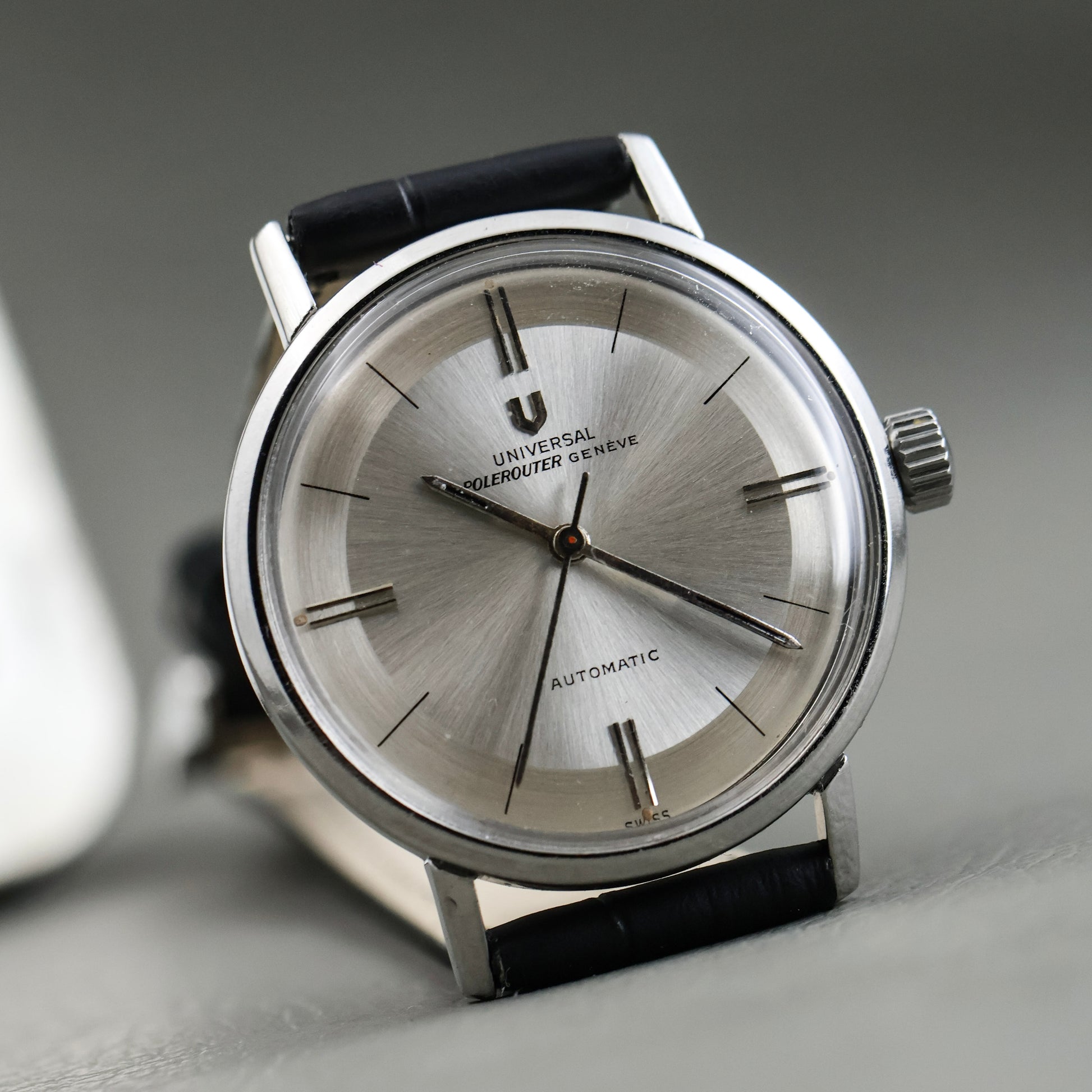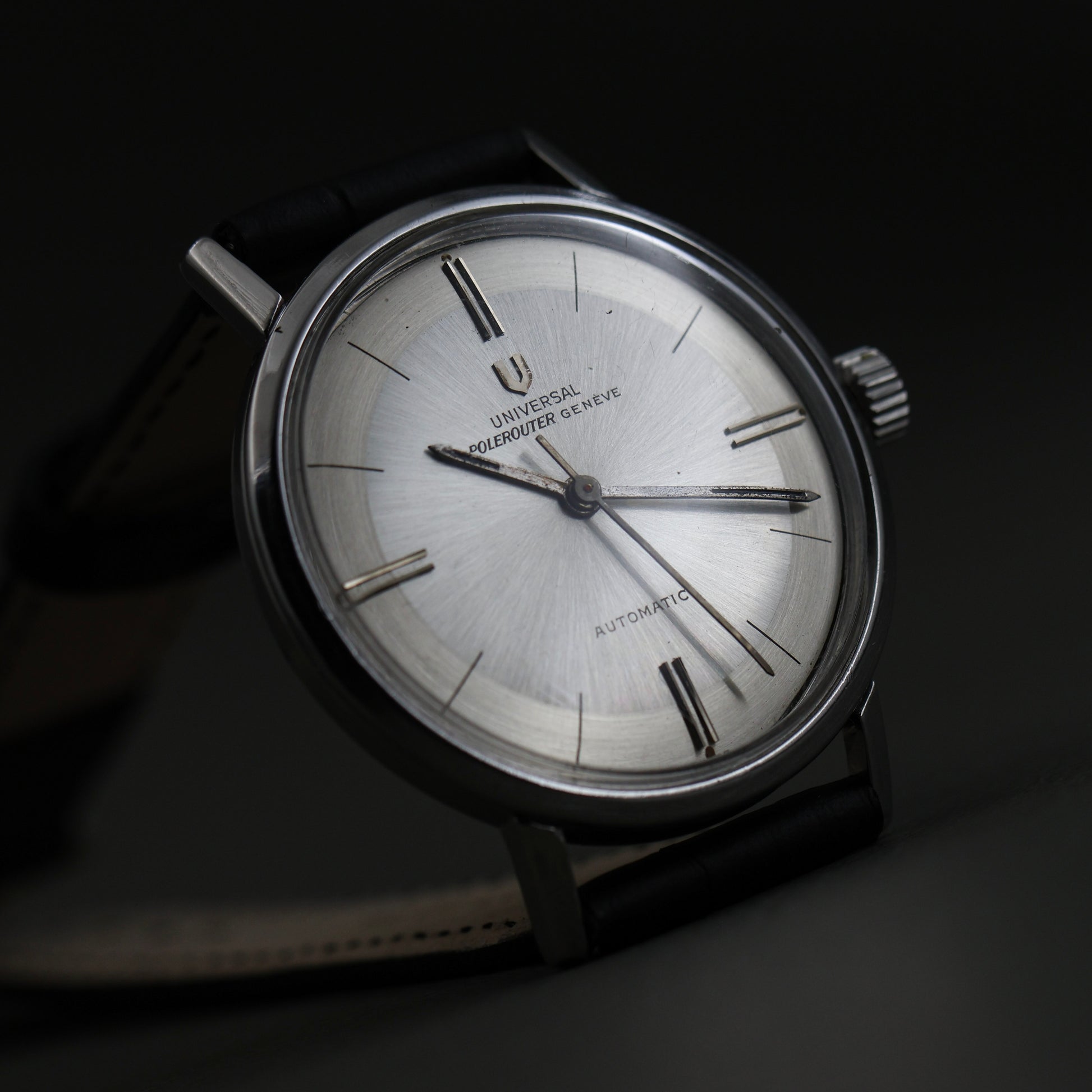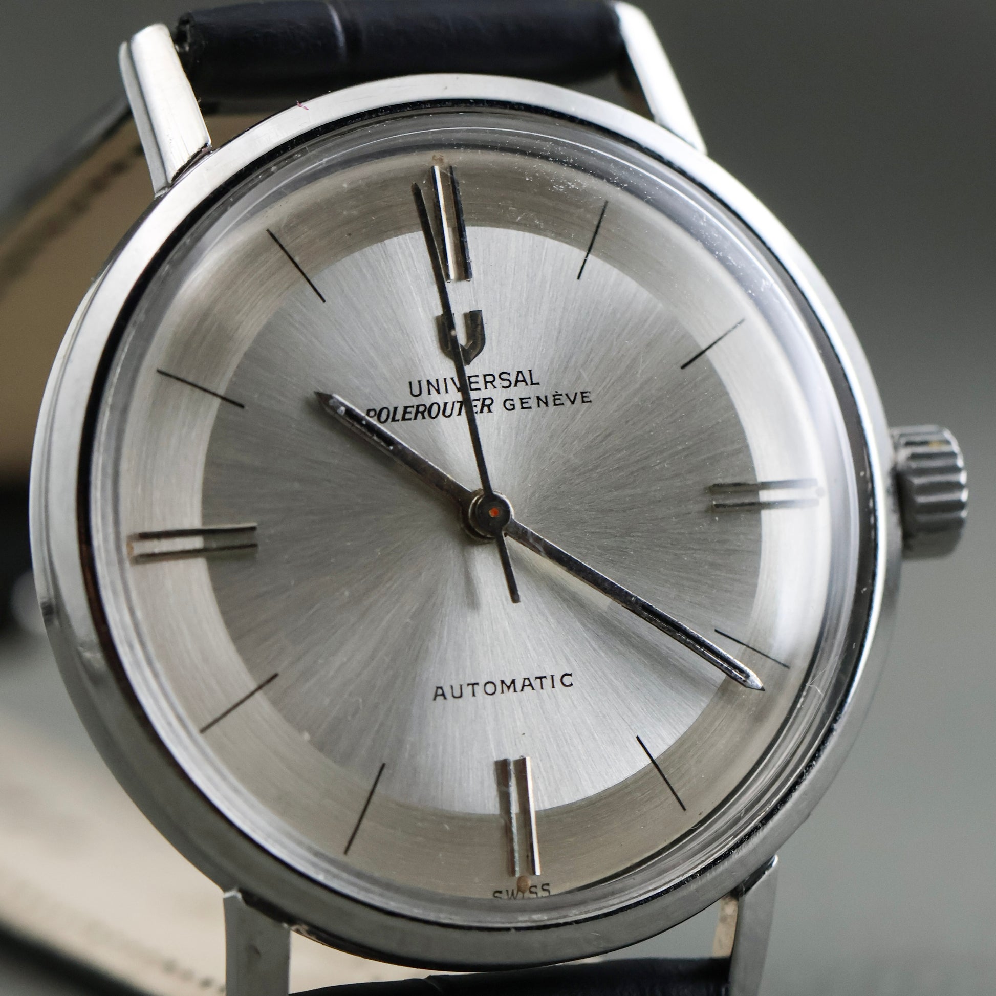 This example is fitted with an aftermarket black leather strap and a replaced crown. Both are common, honest updates seen on many Polerouters that were worn and used as intended.