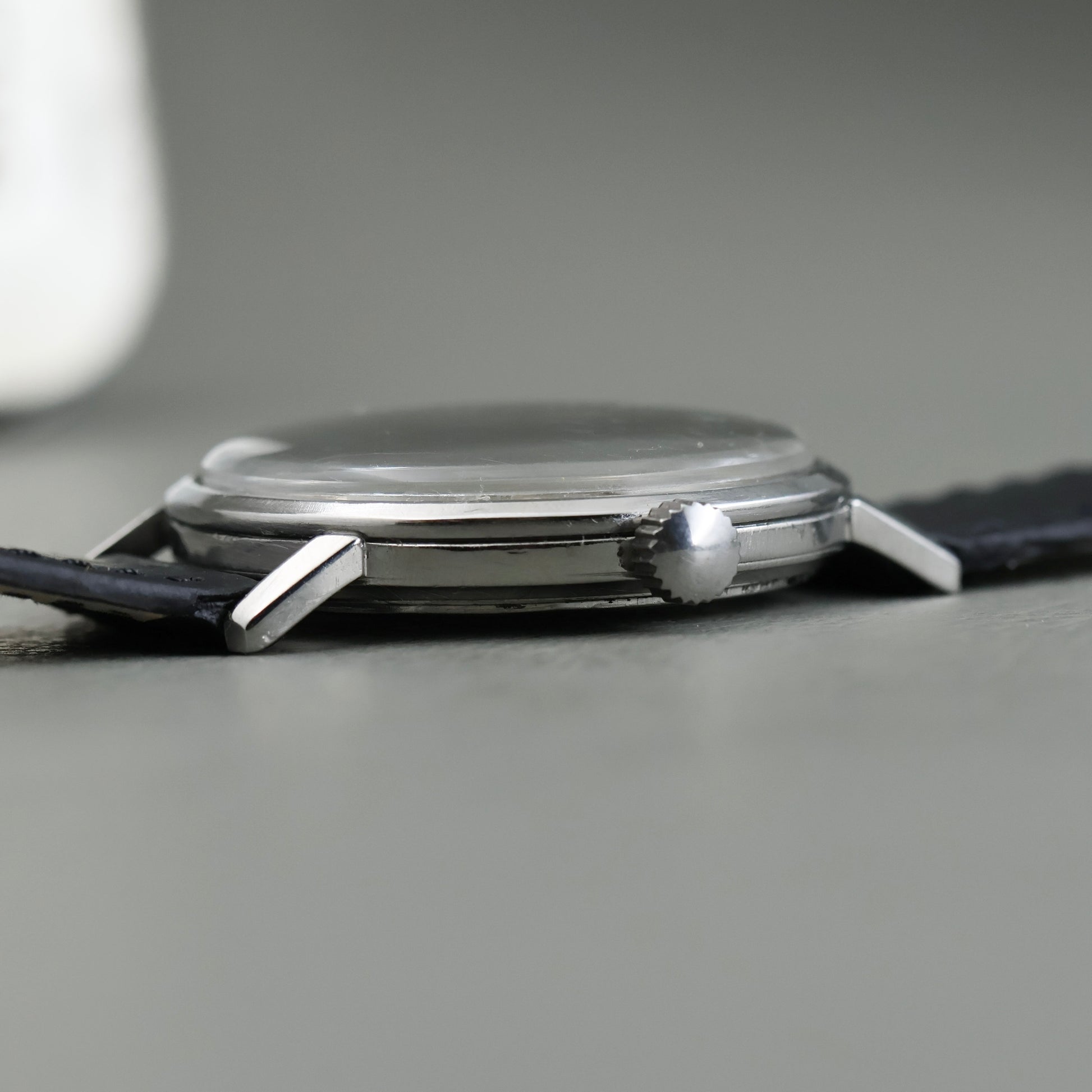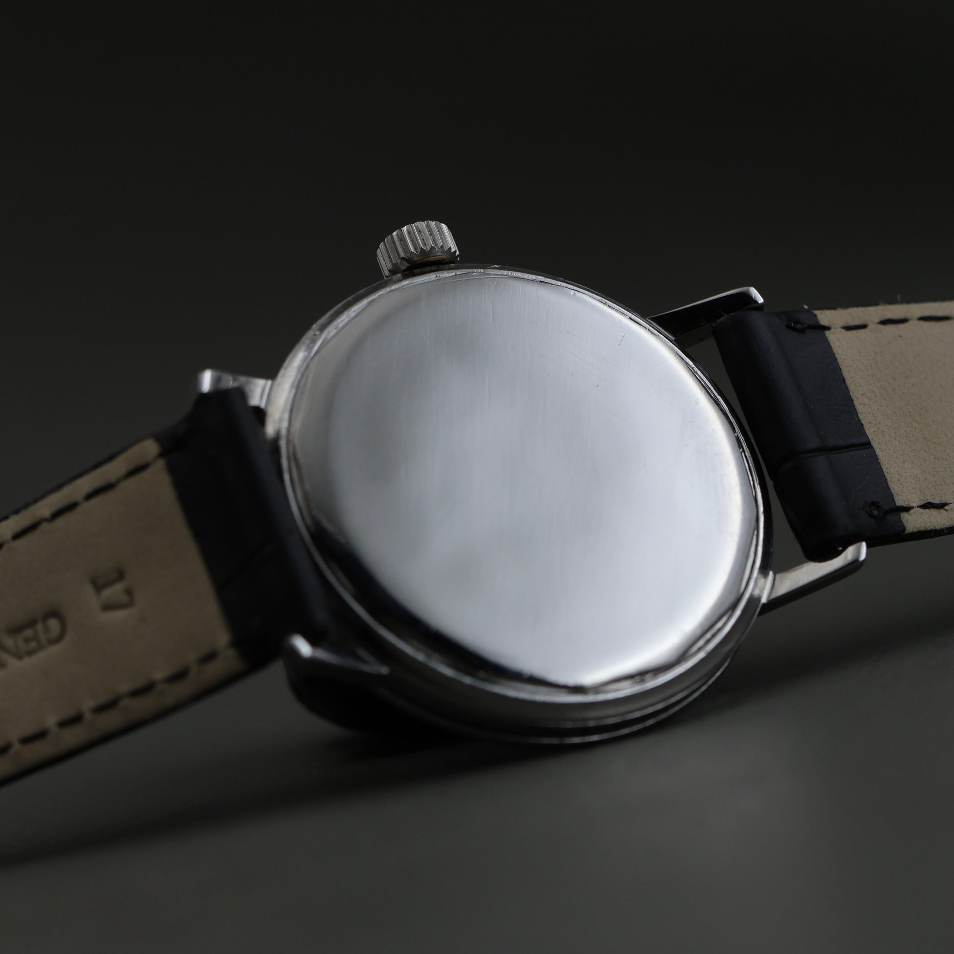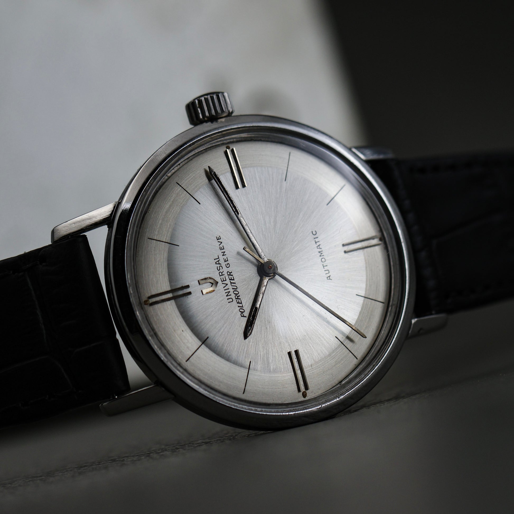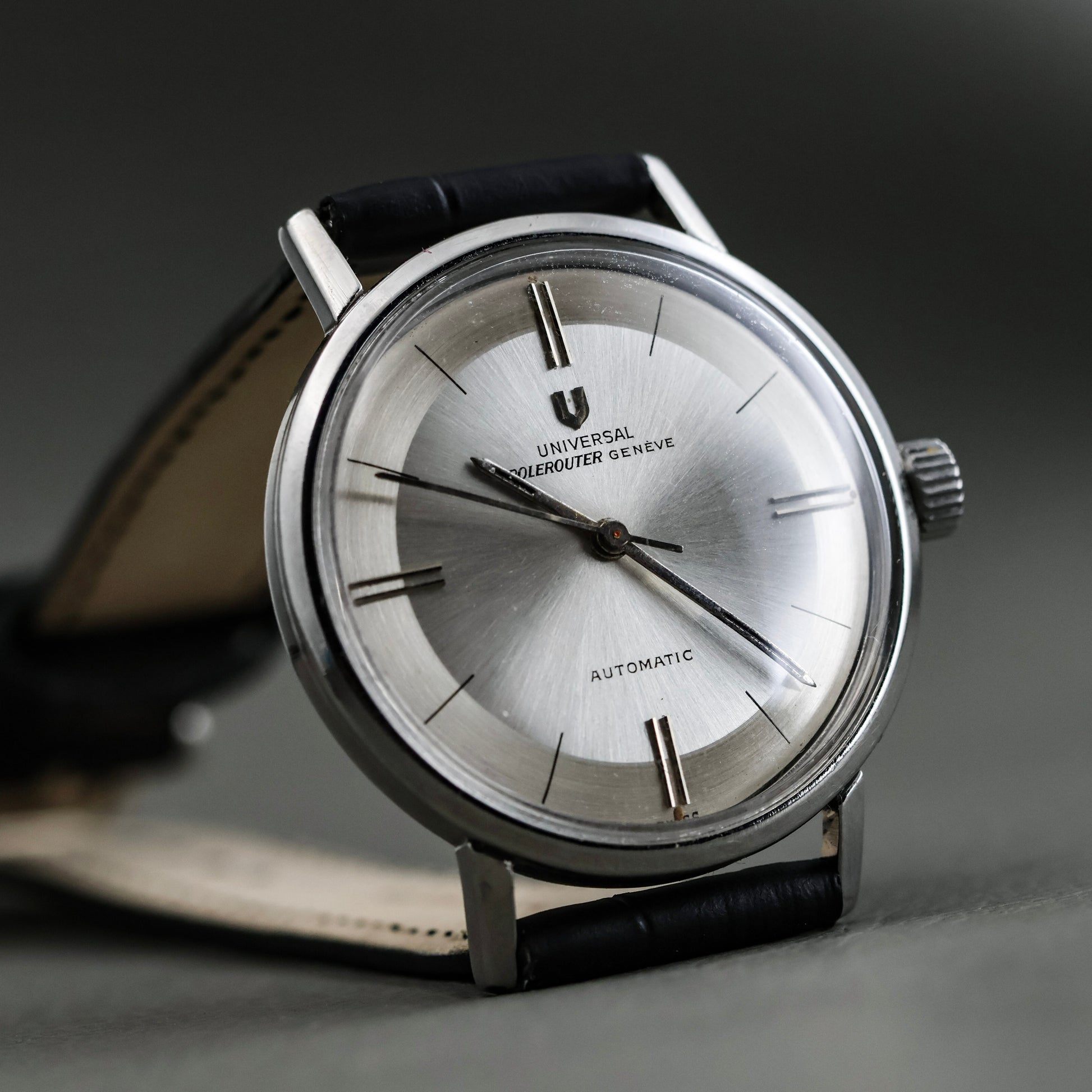 This example is fitted with an aftermarket black leather strap and a replaced crown. Both are common, honest updates seen on many Polerouters that were worn and used as intended.