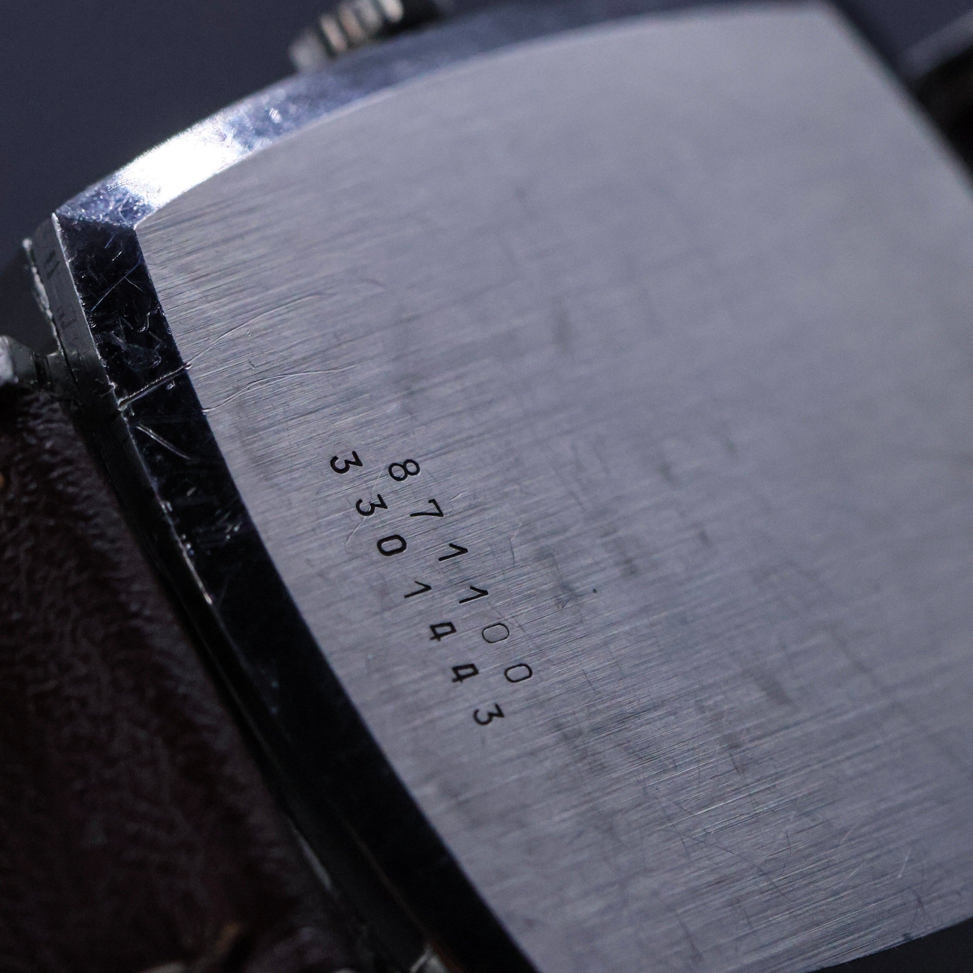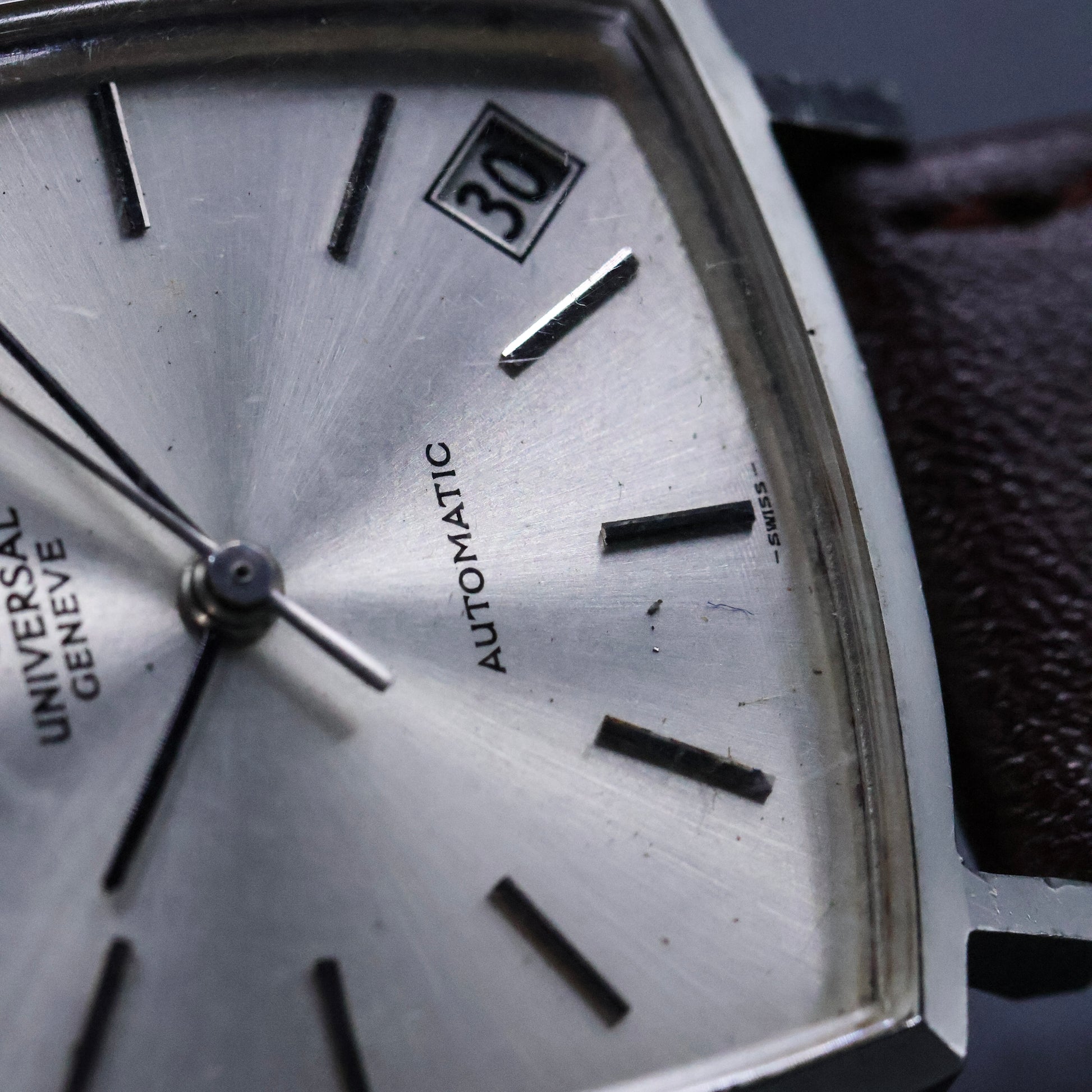 The watch is fitted with an aftermarket leather strap and buckle, keeping the presentation honest while allowing the focus to remain on the head of the watch.
